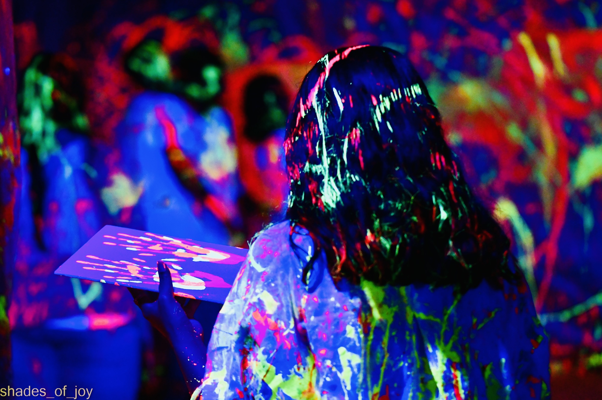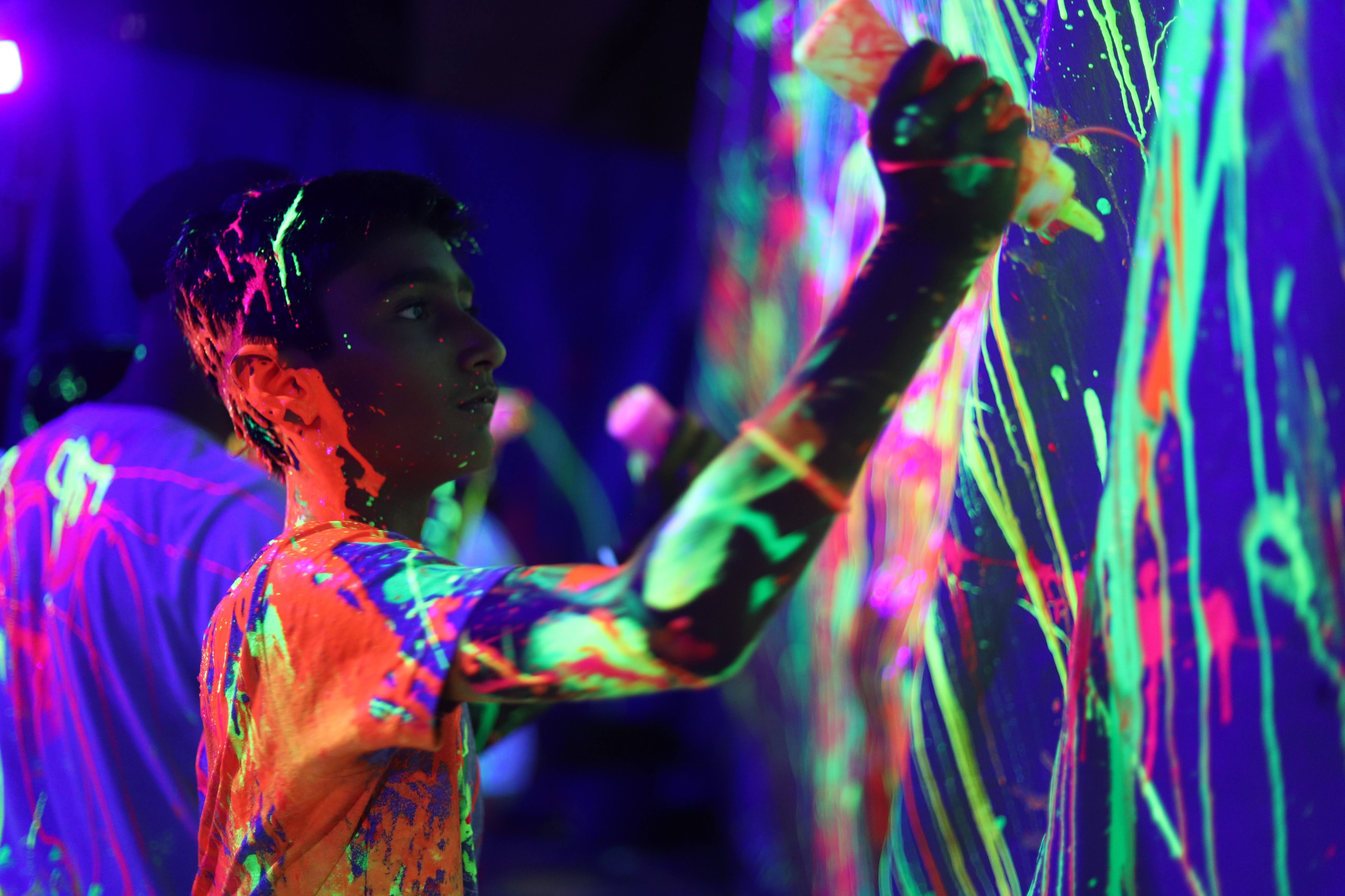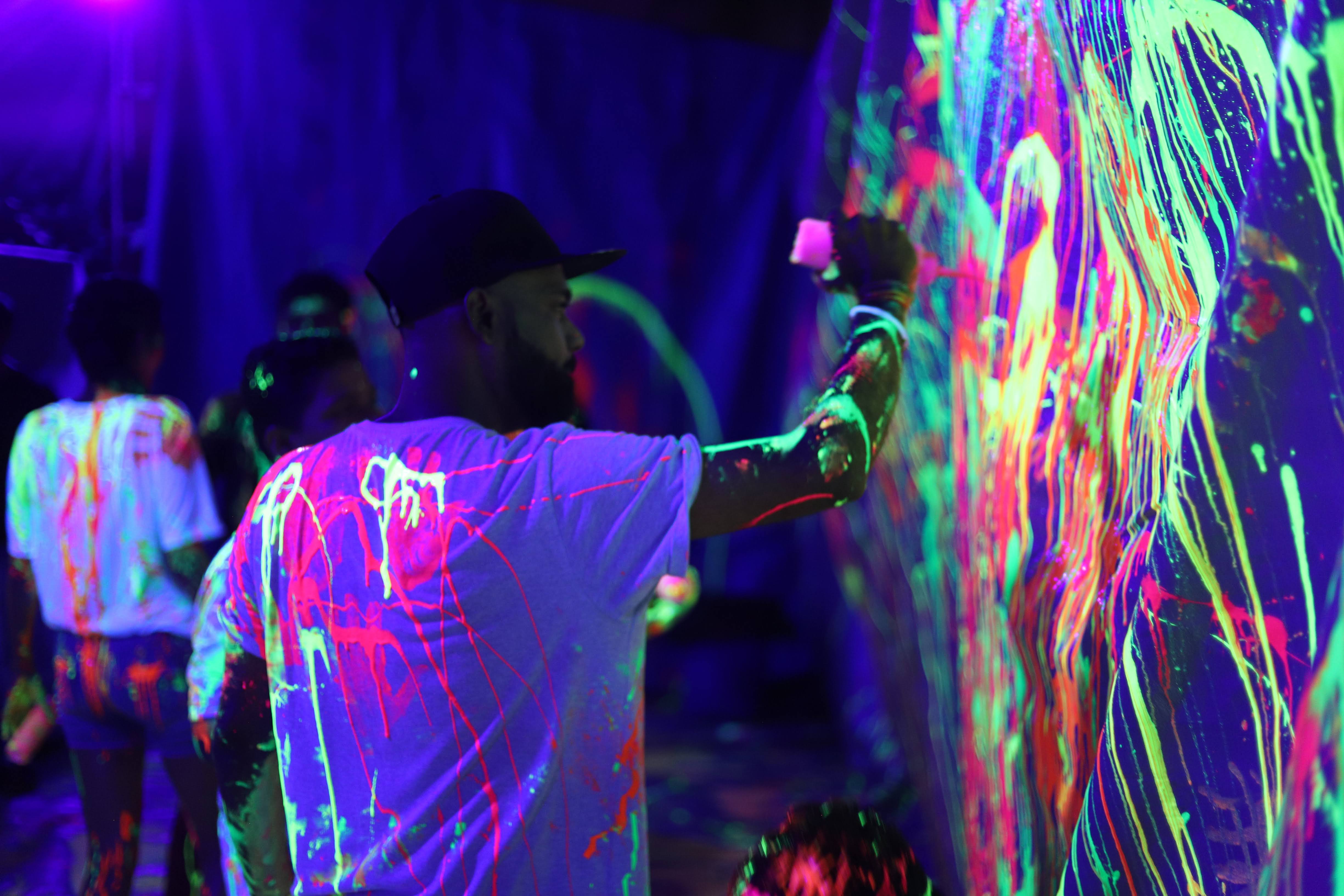 Book any slot after 7 PM and the entire studio shifts to Neon mode — black light on, fluorescent paints flowing, every splatter glowing.